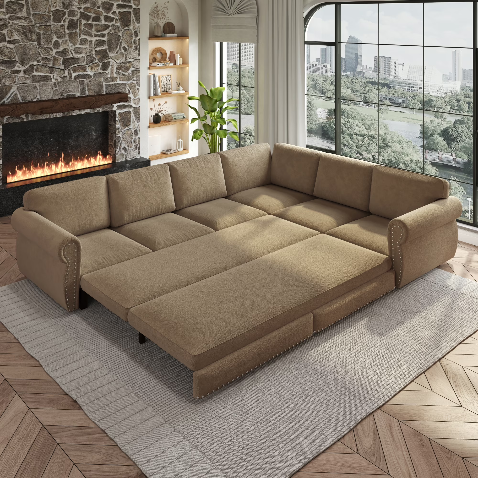 LLappuil 118" Sectional Sofa, 6 Seat Sofa Couch Convertible Sofa Bed, Chenille Sofa with Pull Out Sofa Bed for Living Room Camel