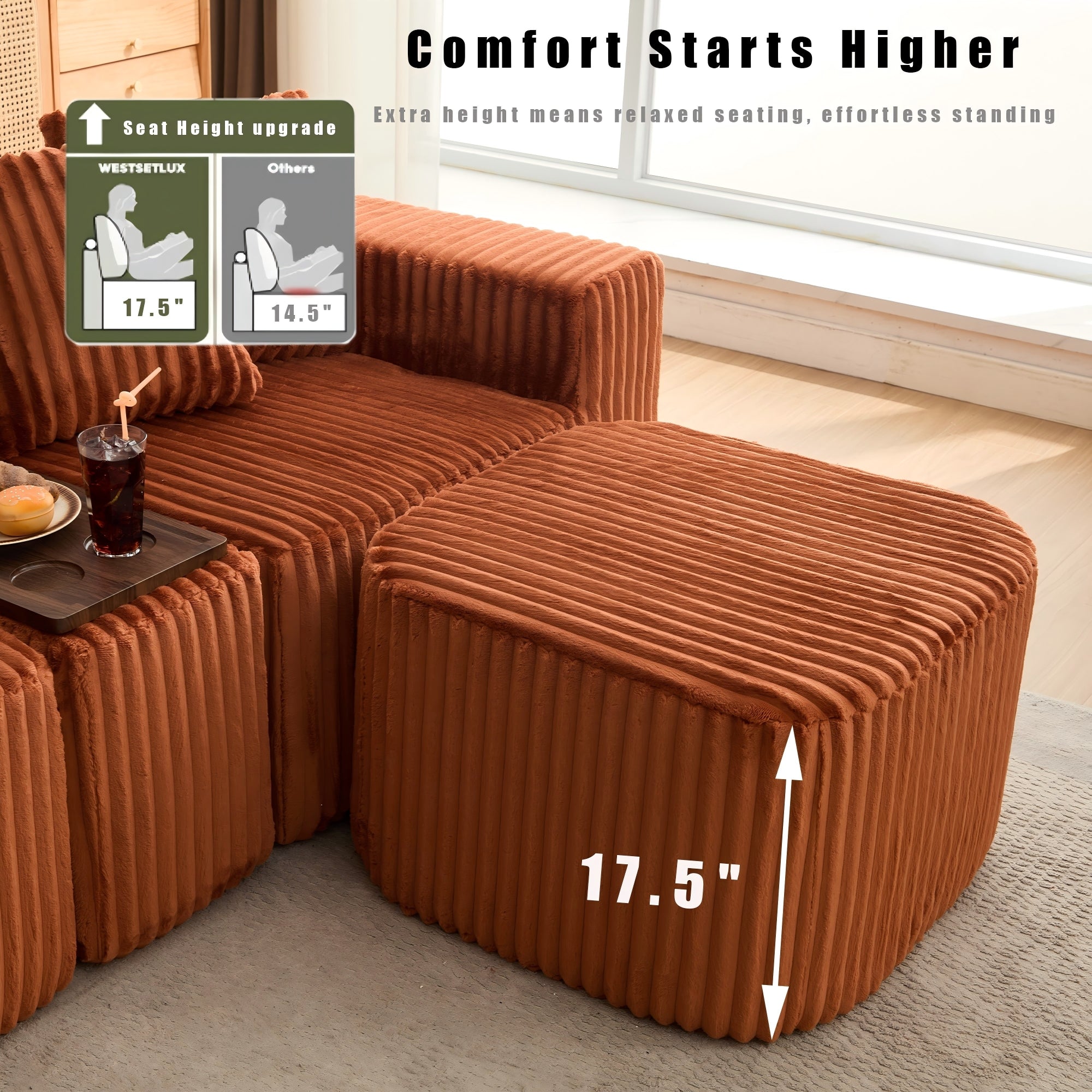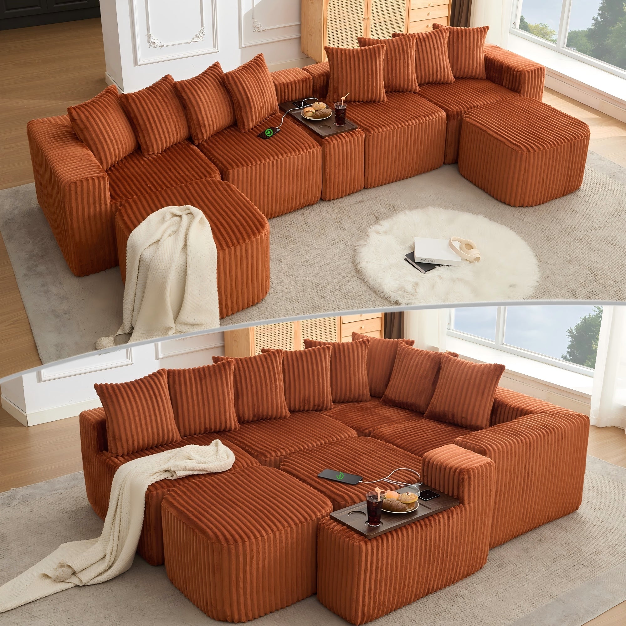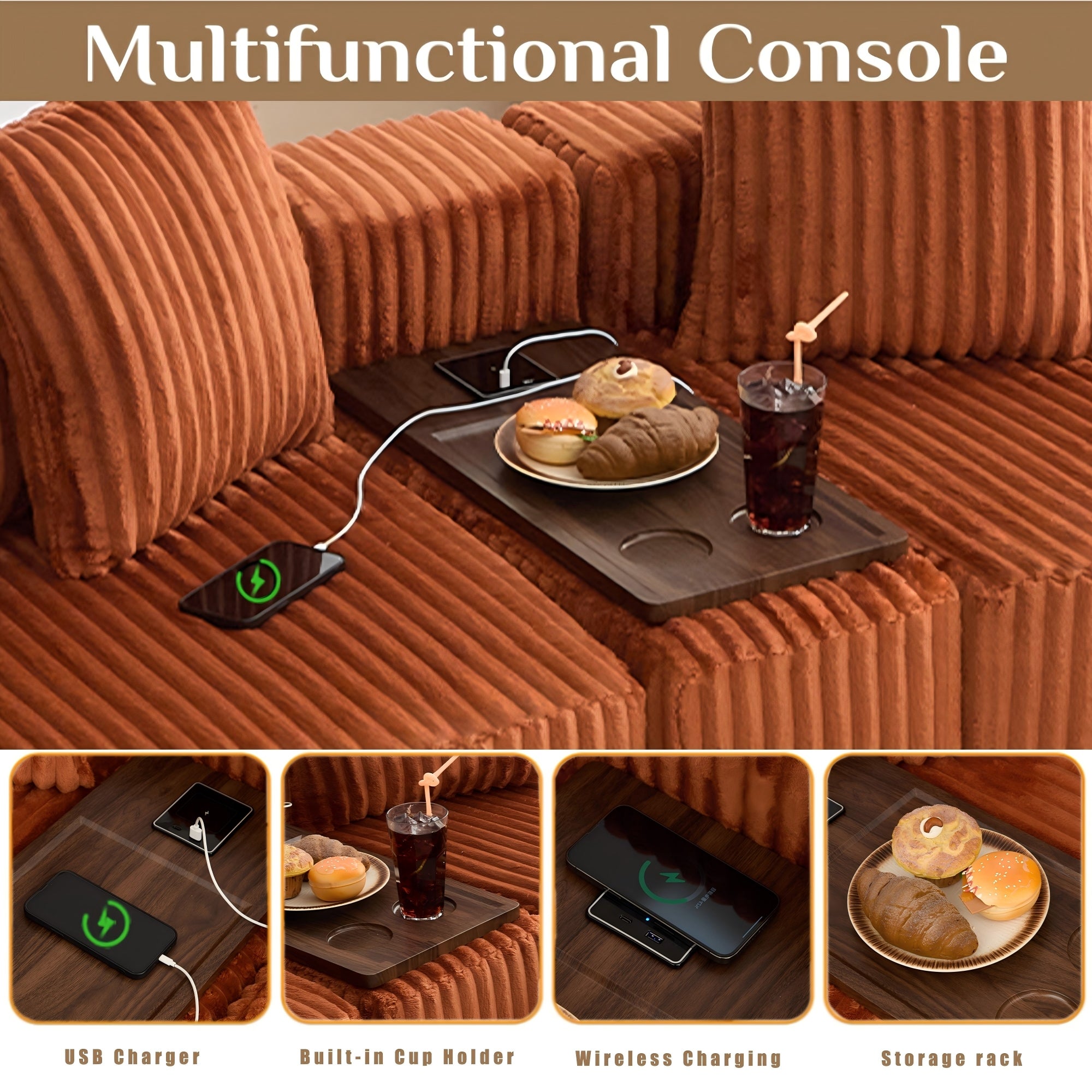 LLappuil 138" Modular Sectional Sofa, Sectional Sofa with USB & Wireless Charge, 6 Seat Corduroy Sofa Couch with Coffee Table Board for Living Room Orange