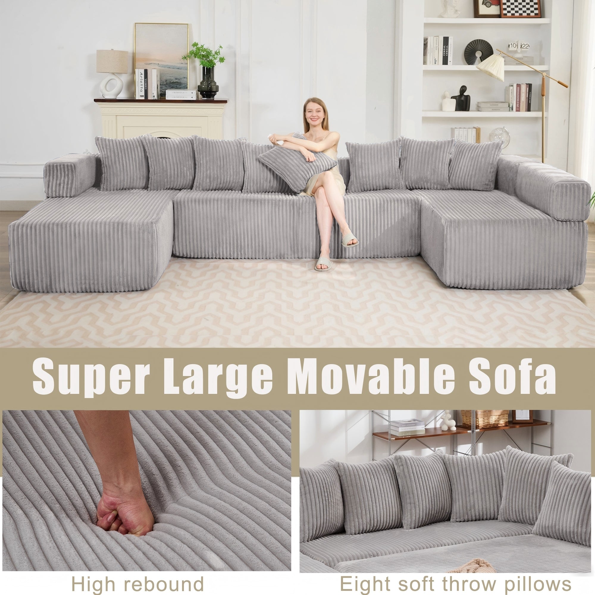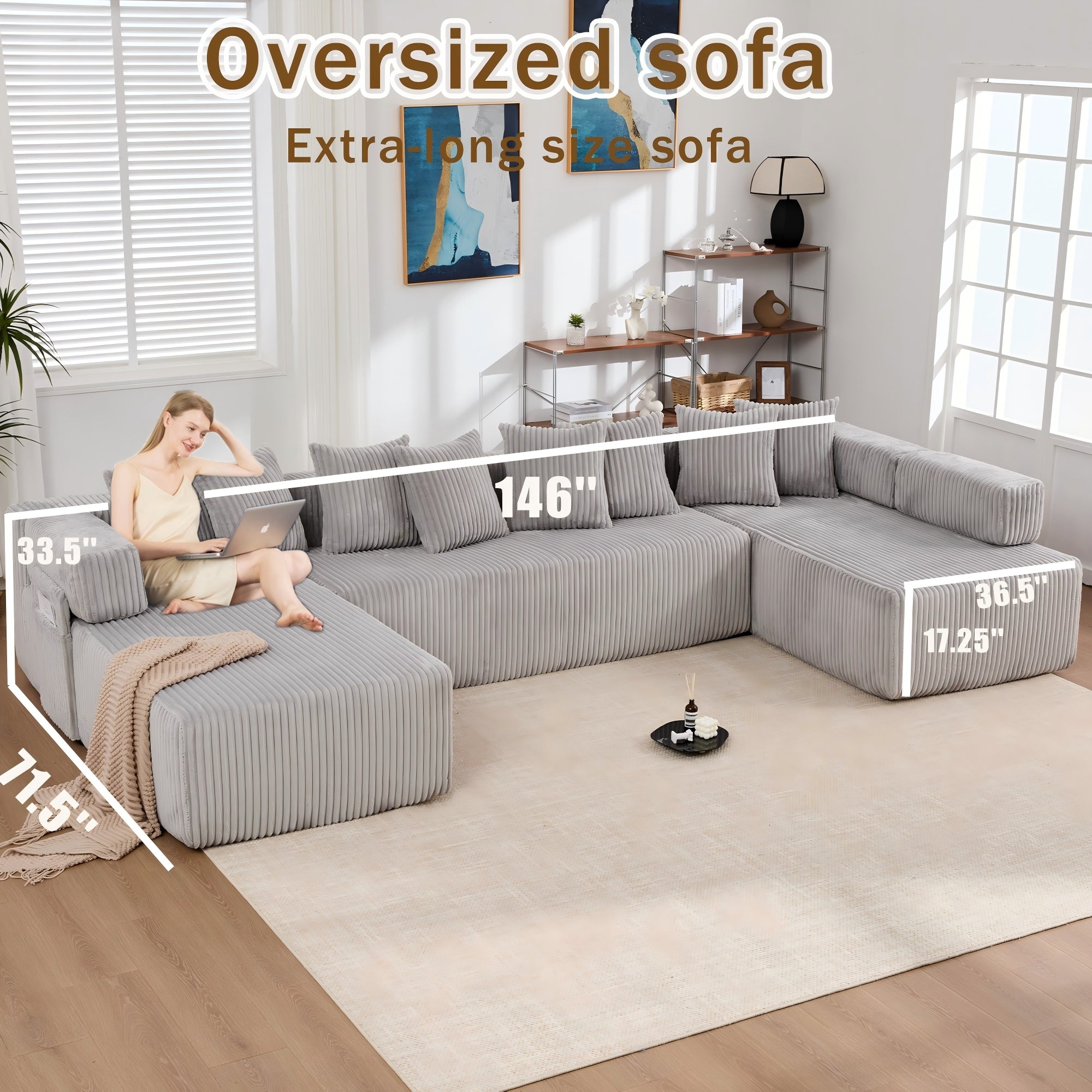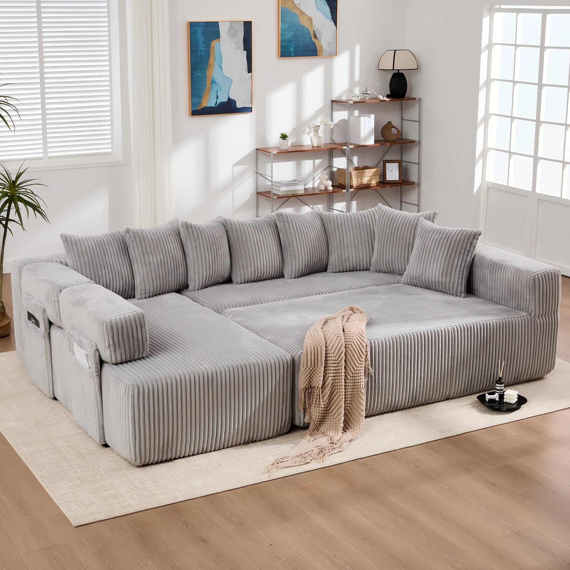 LLappuil 146" Sectional Sofa, U Shaped Sectional Couch with Chaise, 5 Seat Corduroy Sofa Convertible Sleeper Sofa Bed for Living Room Gray