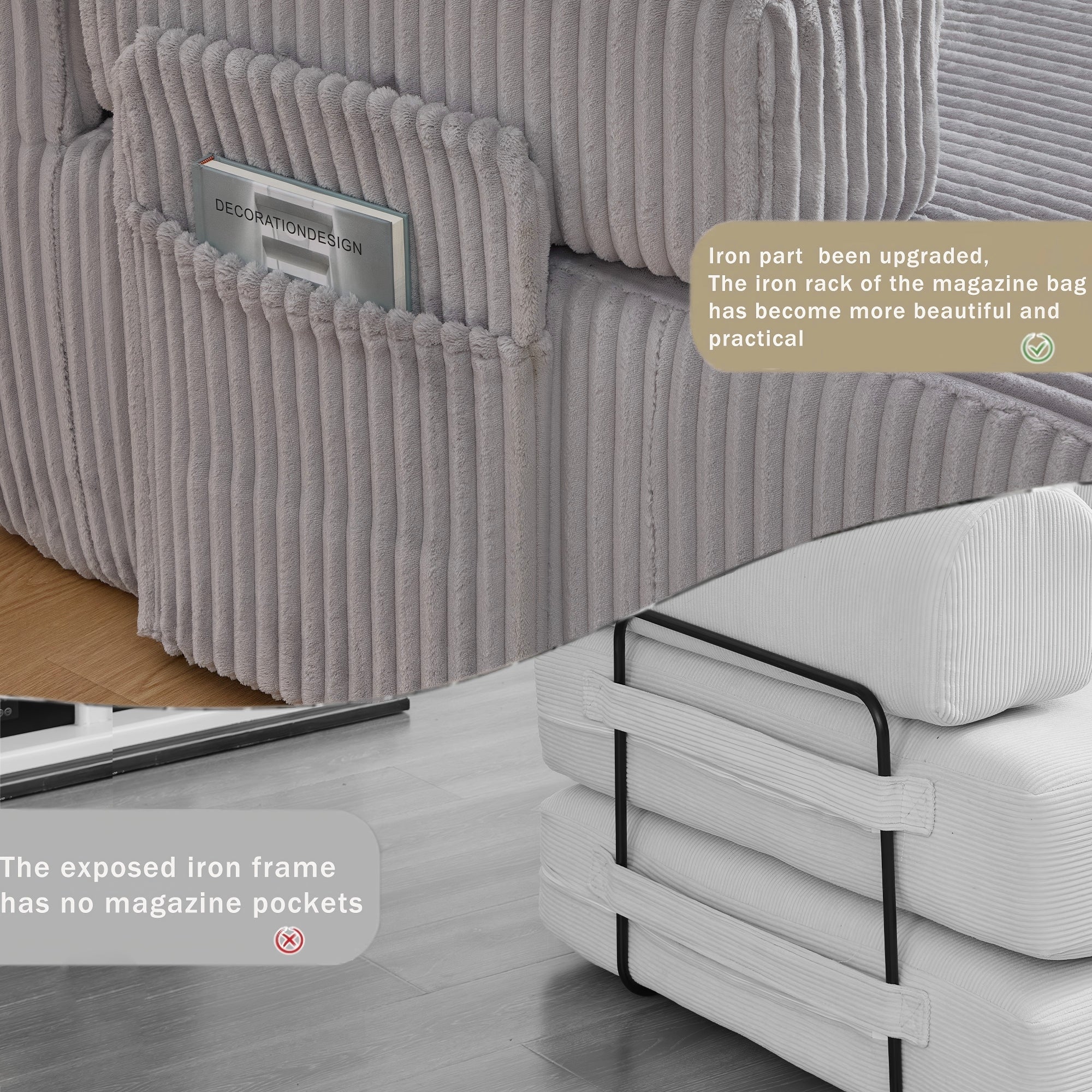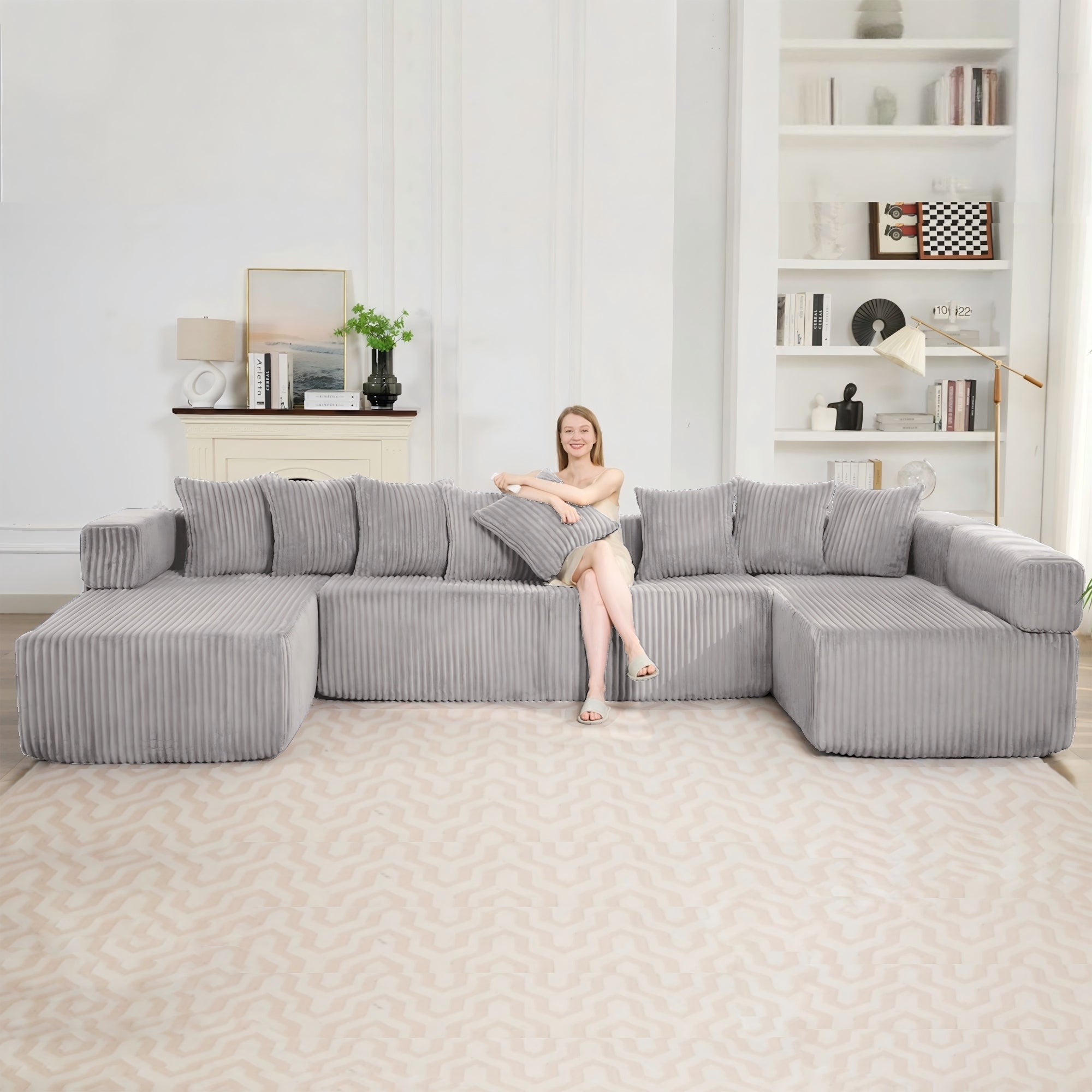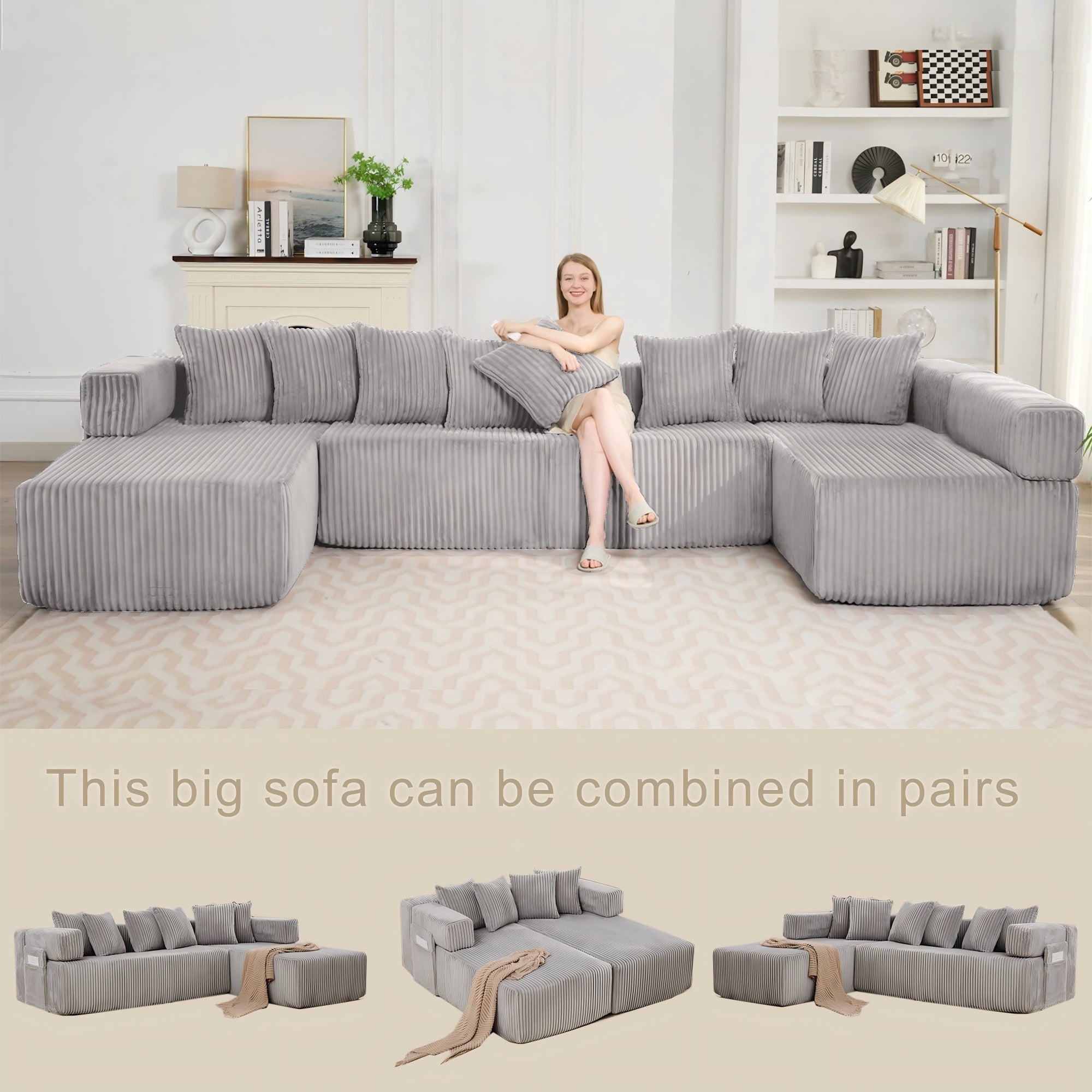LLappuil 146" Sectional Sofa, U Shaped Sectional Couch with Chaise, 5 Seat Corduroy Sofa Convertible Sleeper Sofa Bed for Living Room Gray