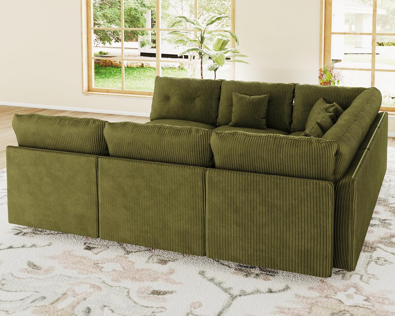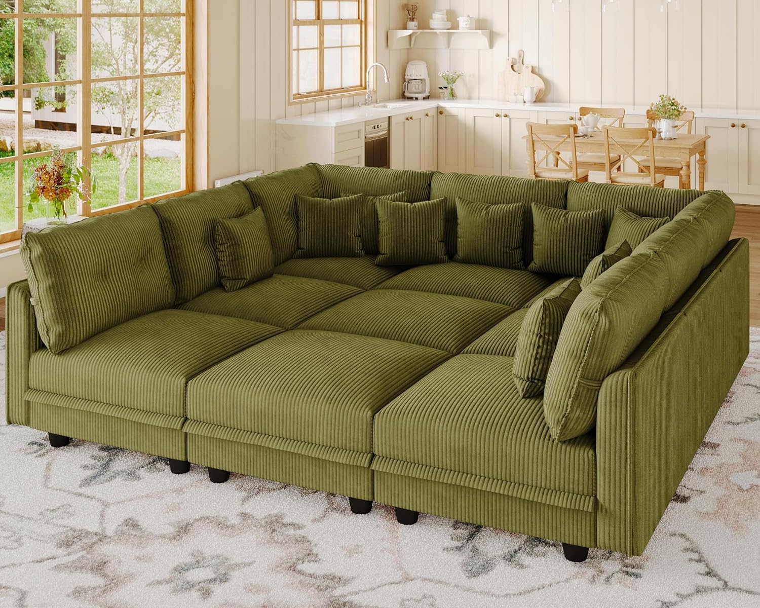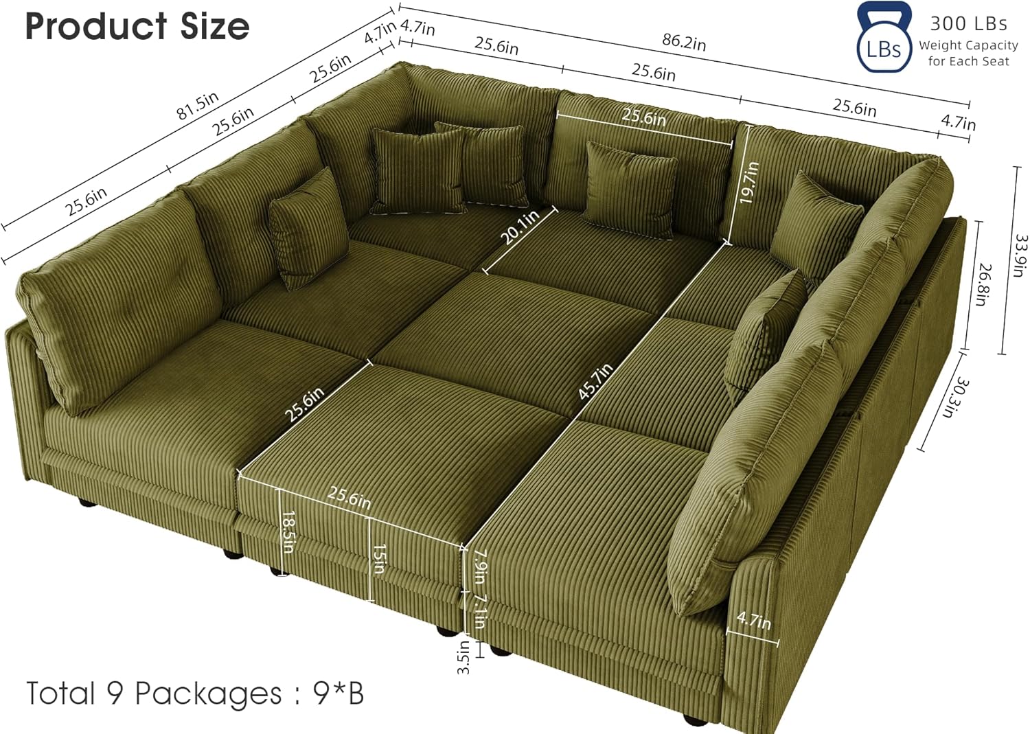 LLappuil Modular Sectional Sofa, 9 Seat Corduroy Sectional Sofa with Storage, 9 Back Cushion 9 Throw Pillow Green