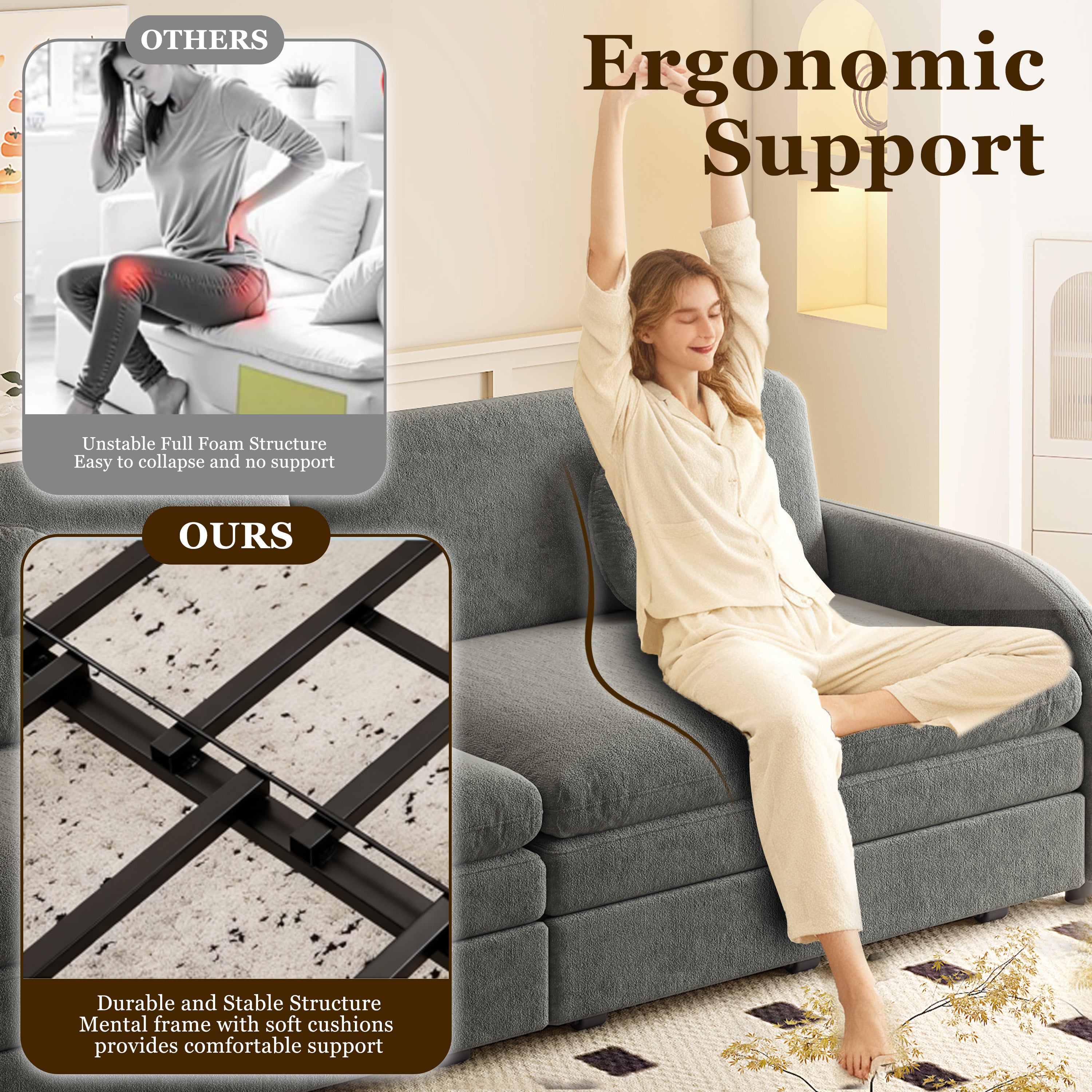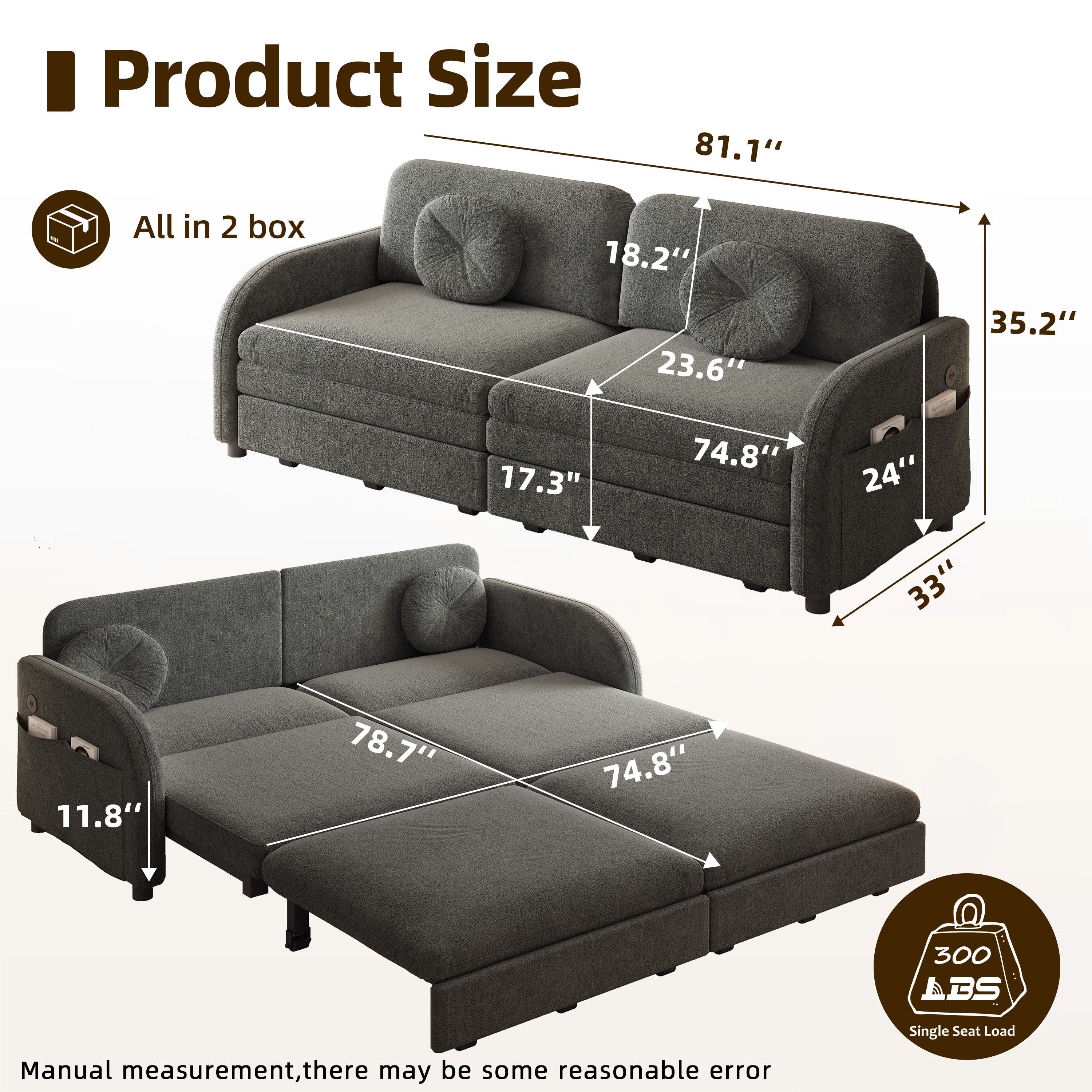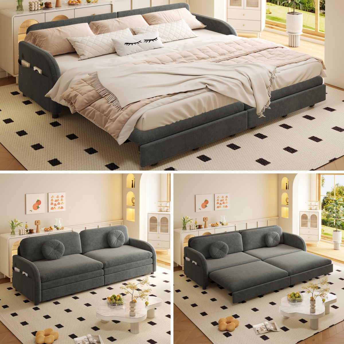 LLappuil Pull Out Sofa Bed King Size, Loveseat Sofa Covertible Sofa Bed, Chenille Sofa Couch with USB Port, Side Pocket for Living Room Gray