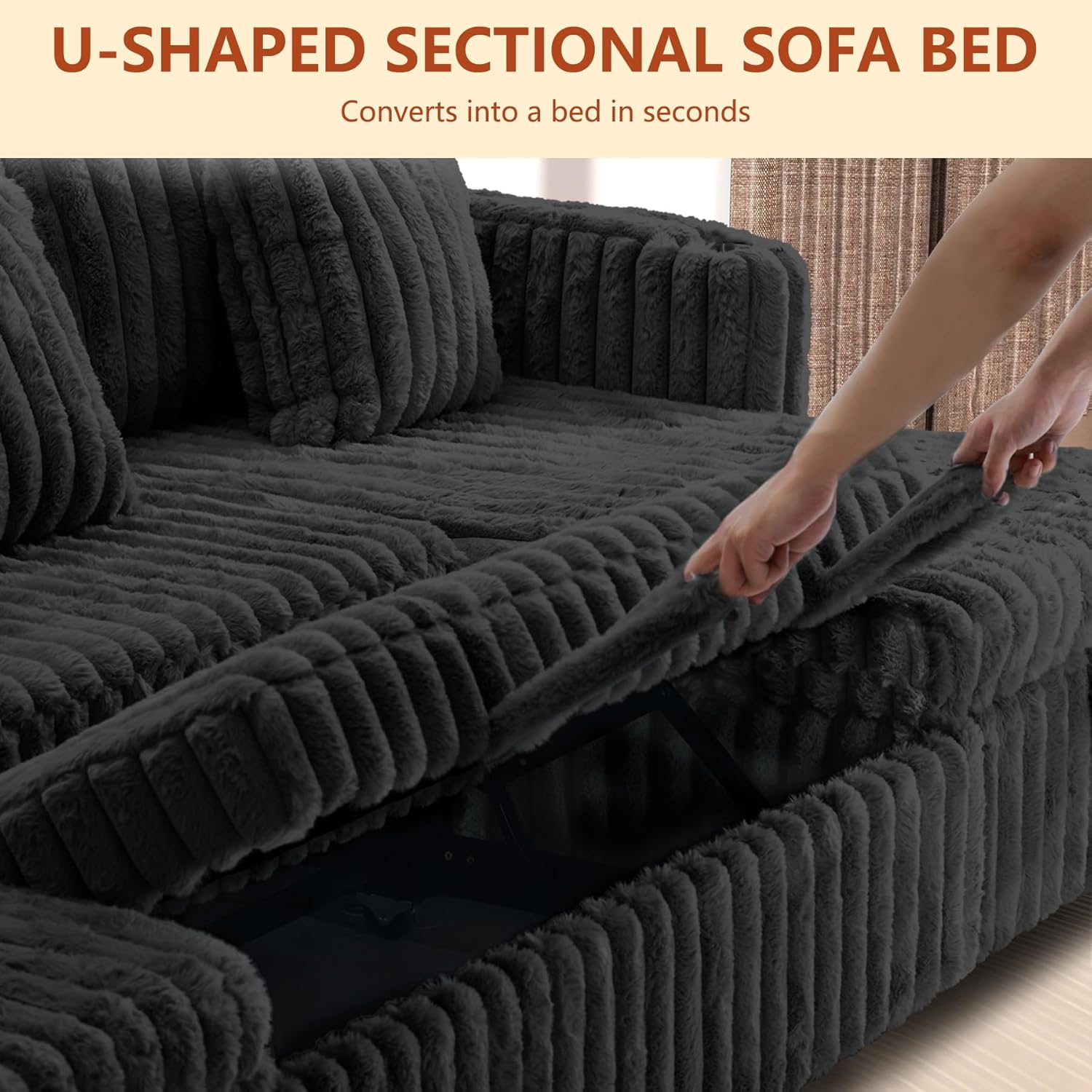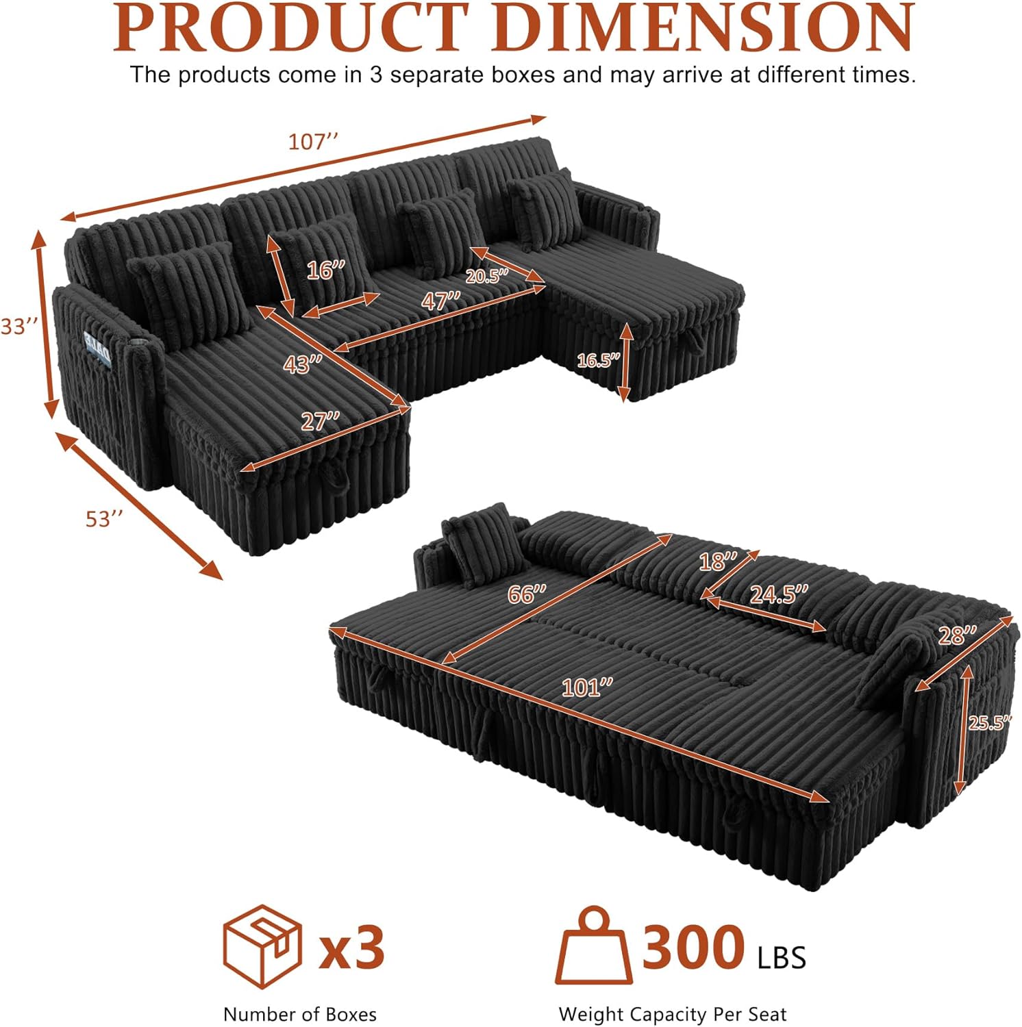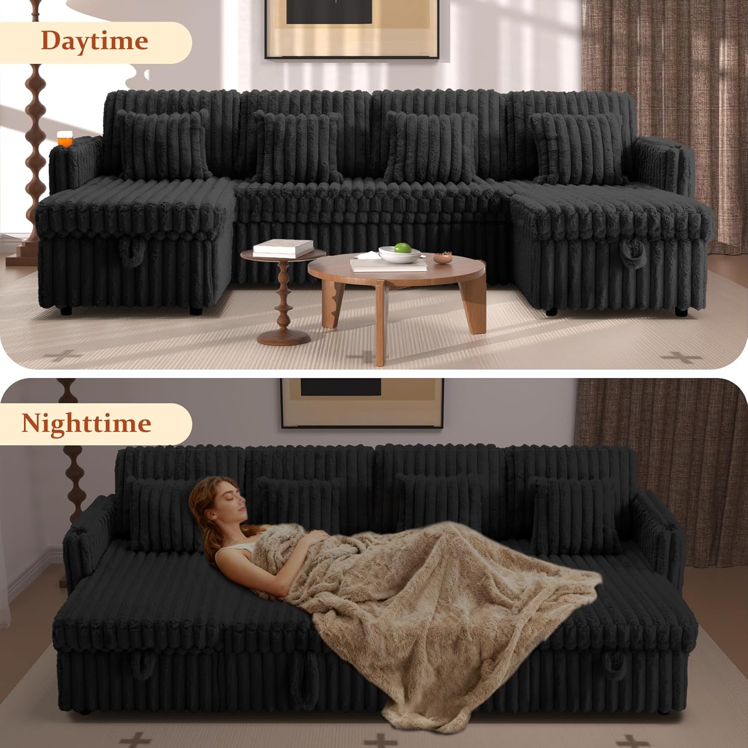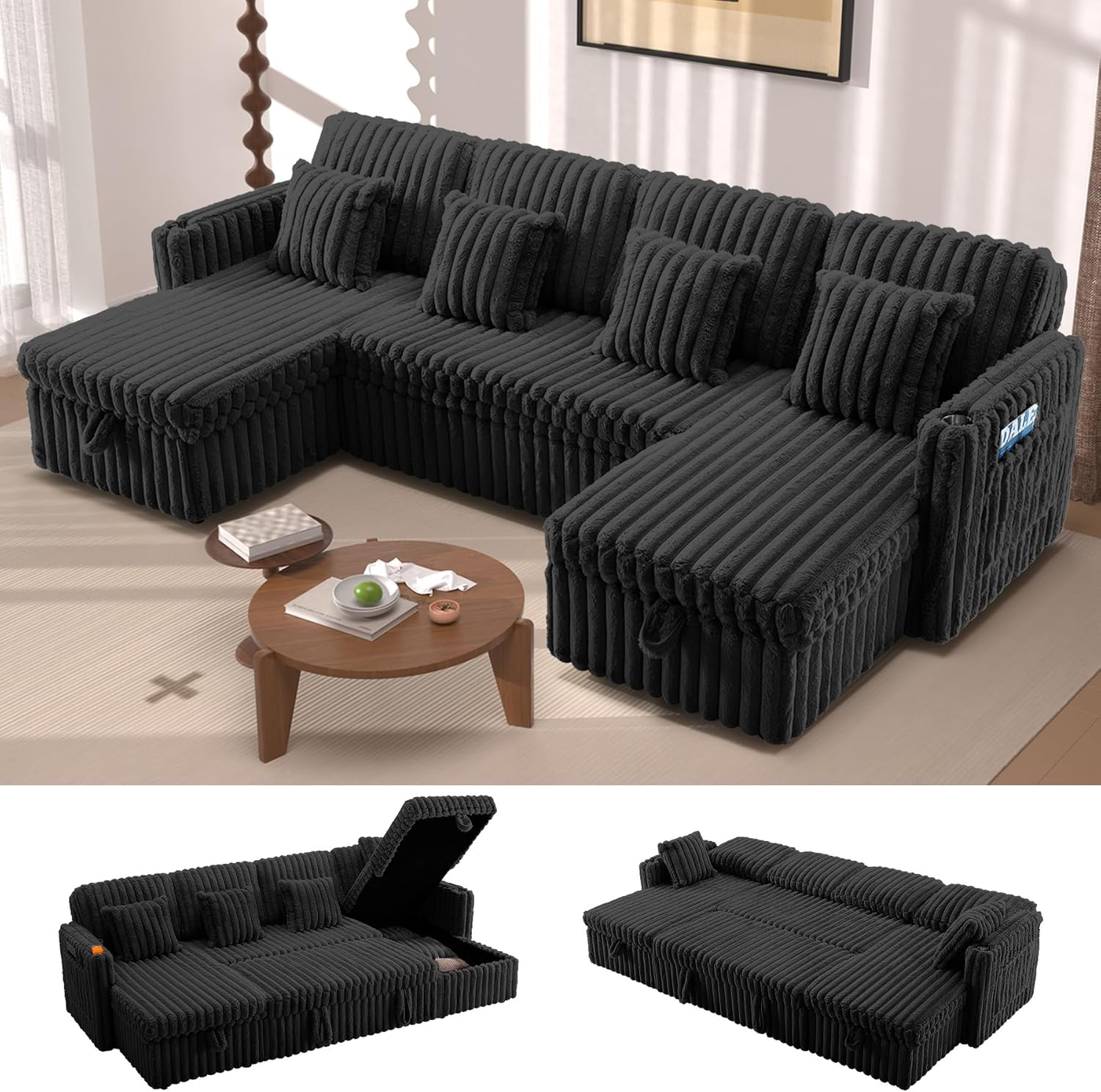 LLappuil Sectional Sofa, 107" U Shaped Sectional Couch with Storage Chaise, Adjustable Backrest, USB Charger, Cup Holder & Side Pocket, Corduroy Sofa with Pull Out Sofa Bed for Living Room Black