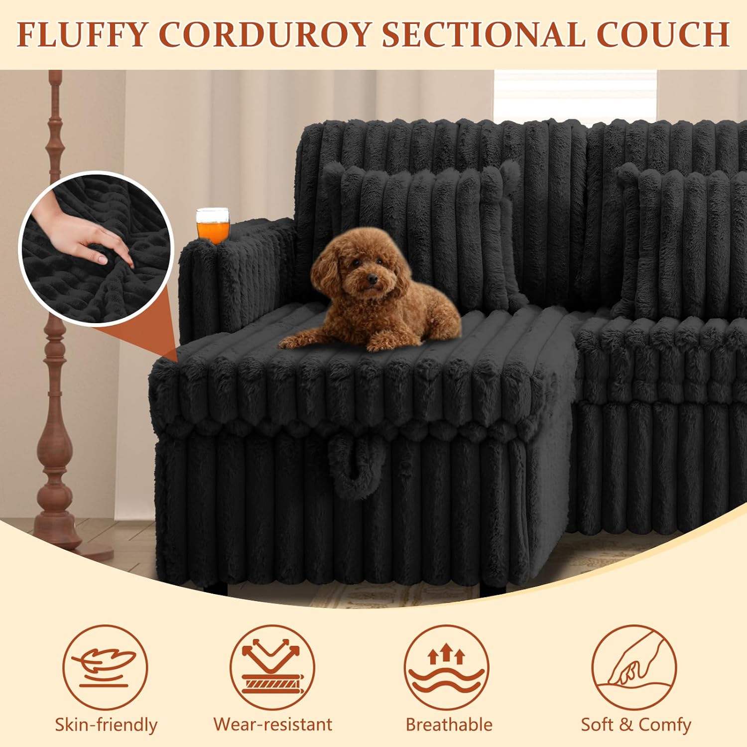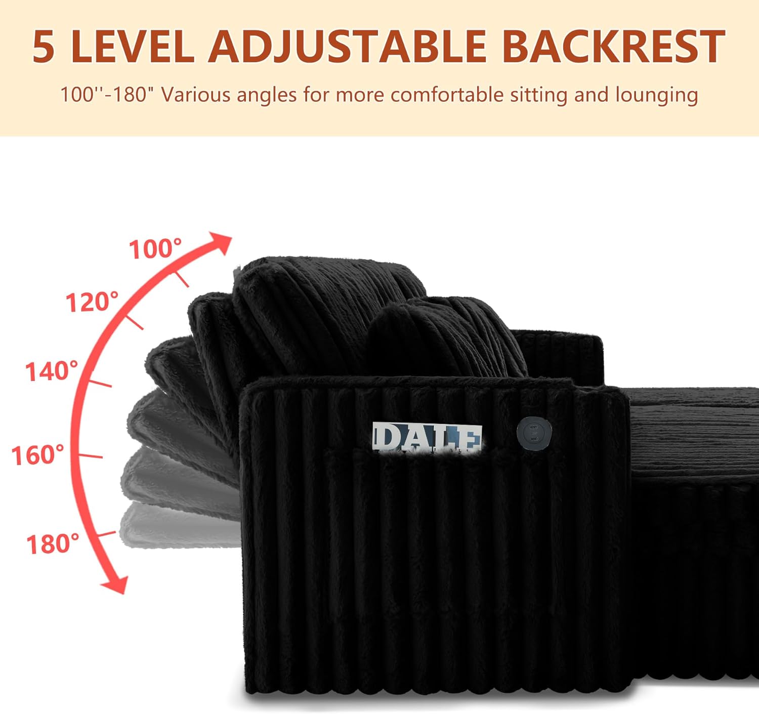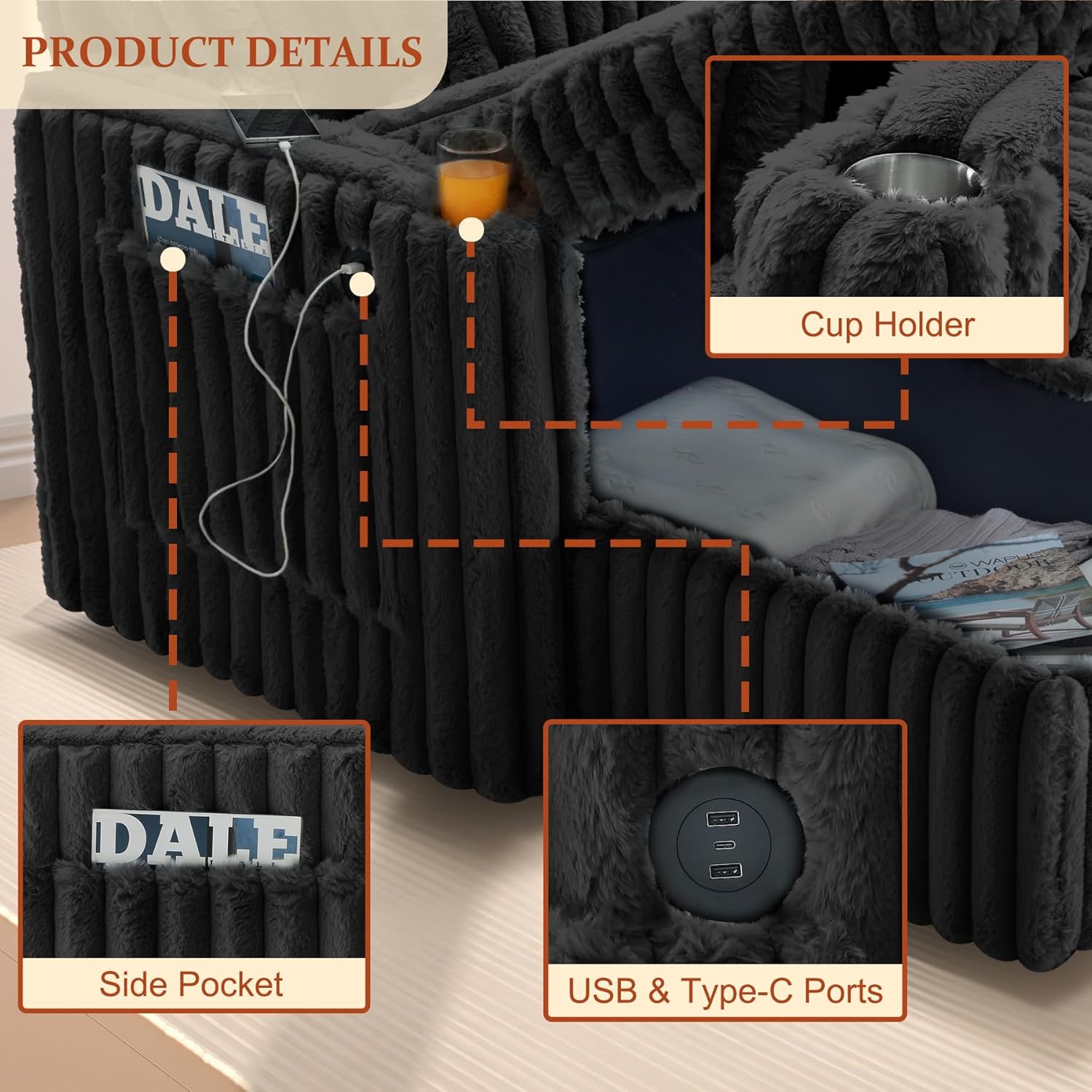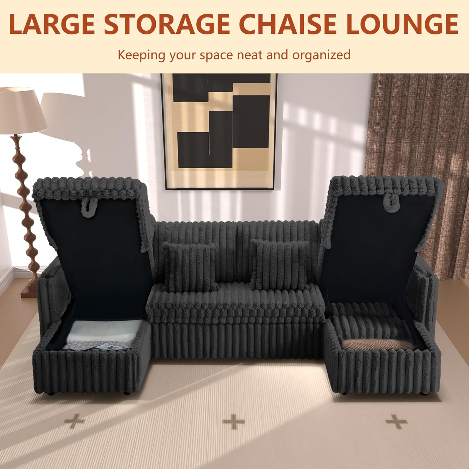 LLappuil Sectional Sofa, 107" U Shaped Sectional Couch with Storage Chaise, Adjustable Backrest, USB Charger, Cup Holder & Side Pocket, Corduroy Sofa with Pull Out Sofa Bed for Living Room Black