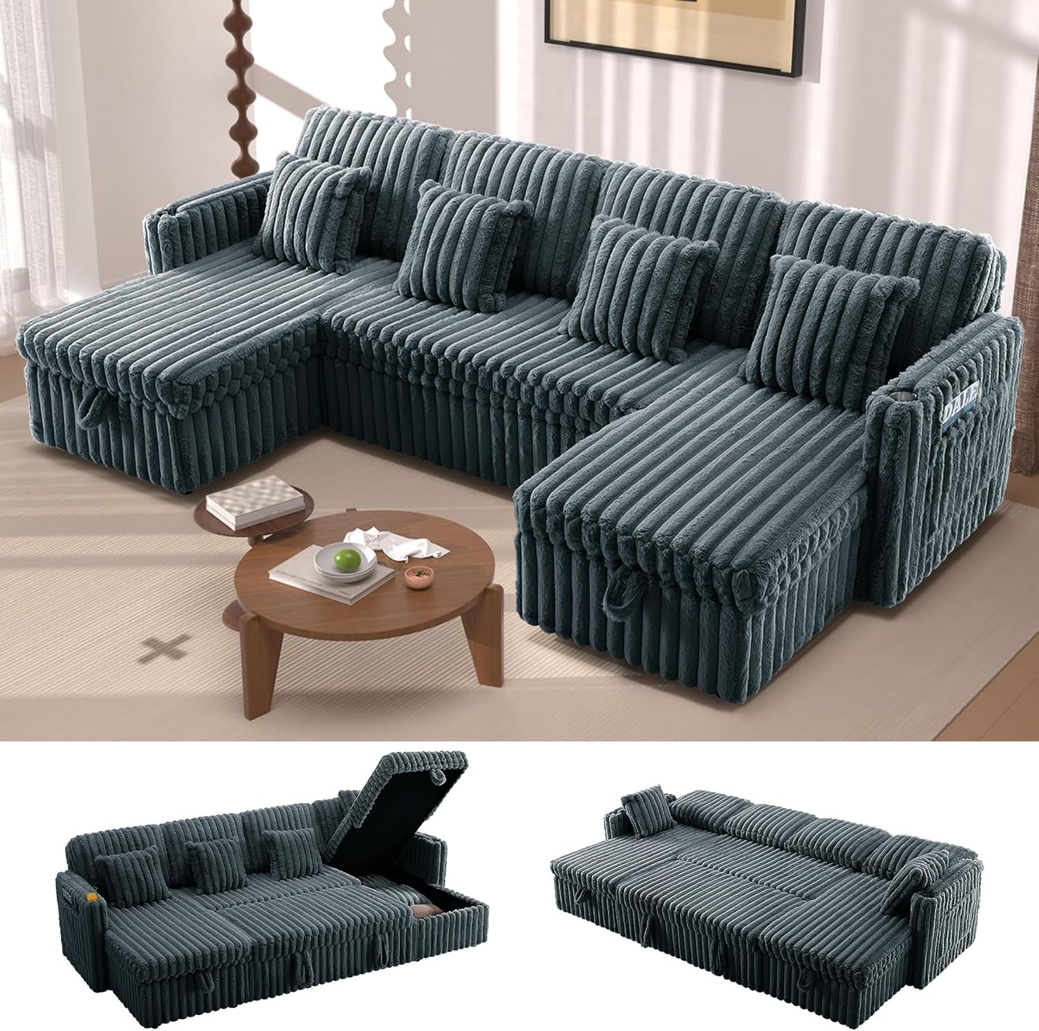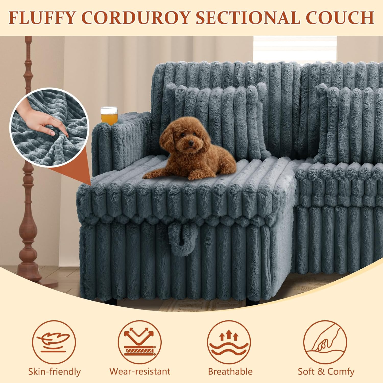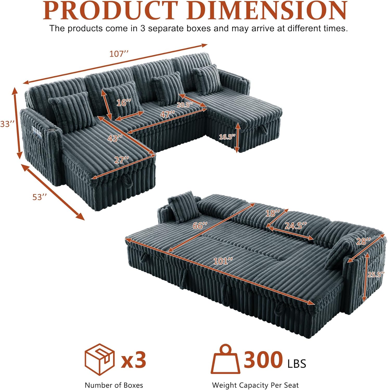 LLappuil Sectional Sofa, 107" U Shaped Sectional Couch with Storage Chaise, Adjustable Backrest, USB Charger, Cup Holder & Side Pocket, Corduroy Sofa with Pull Out Sofa Bed for Living Room Dark Gray