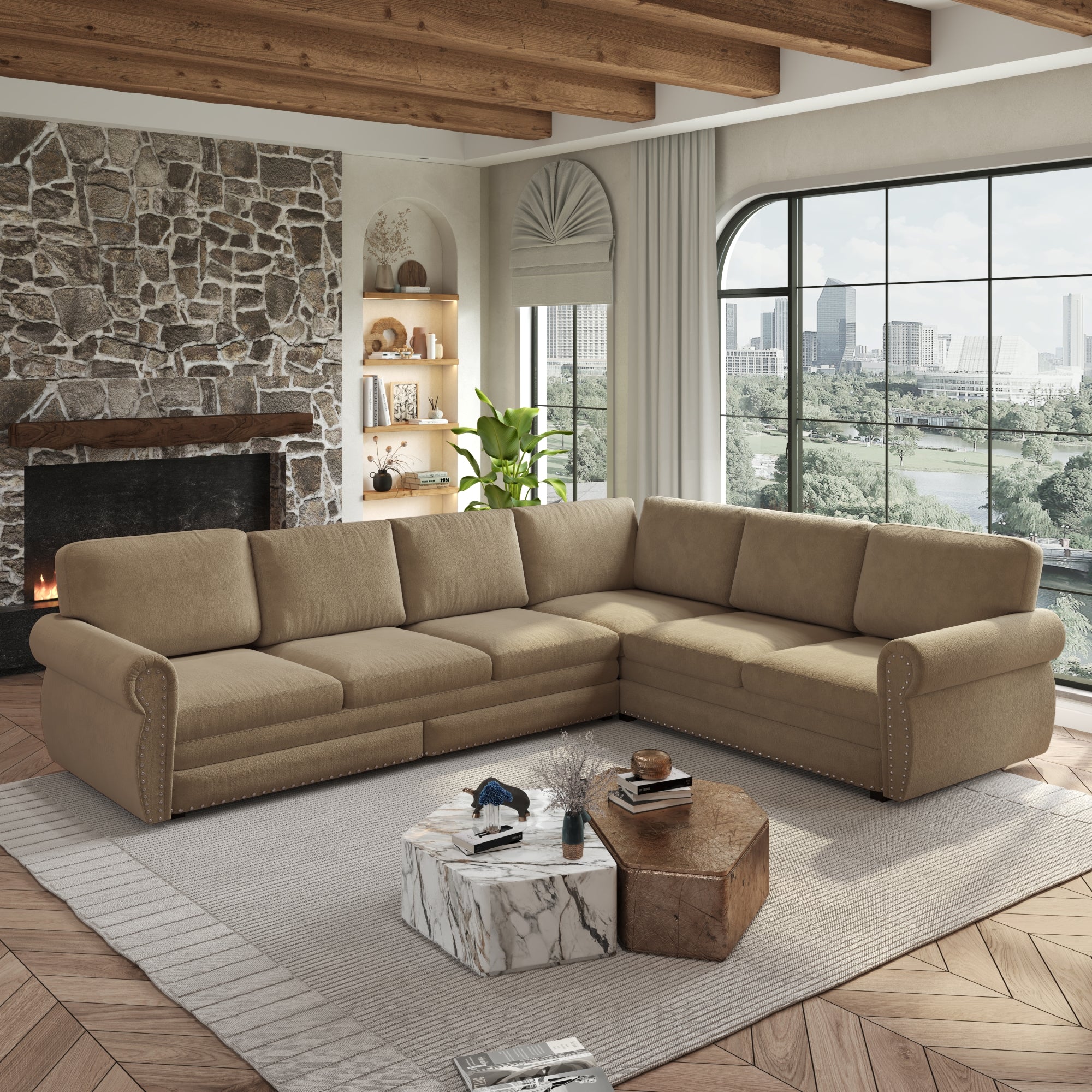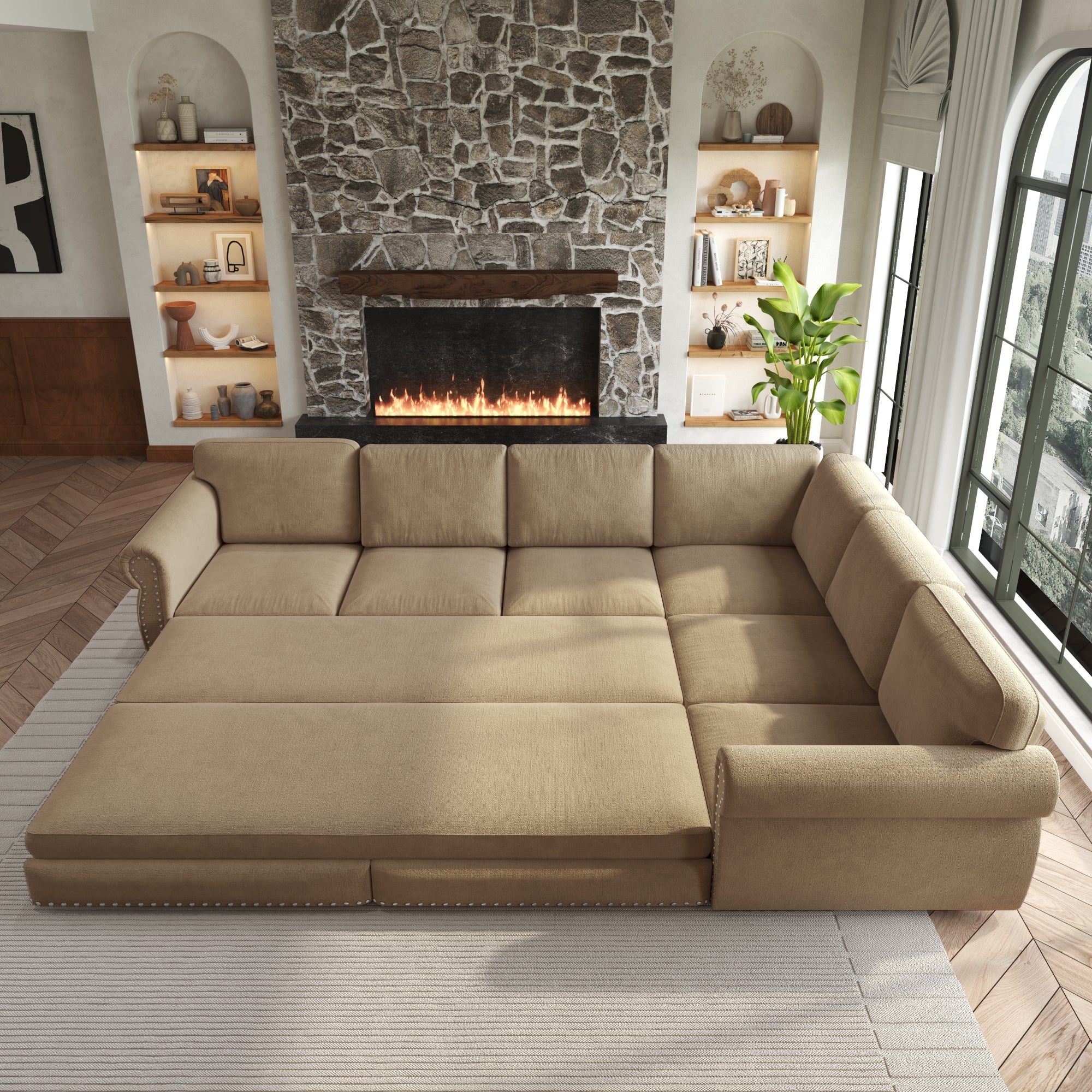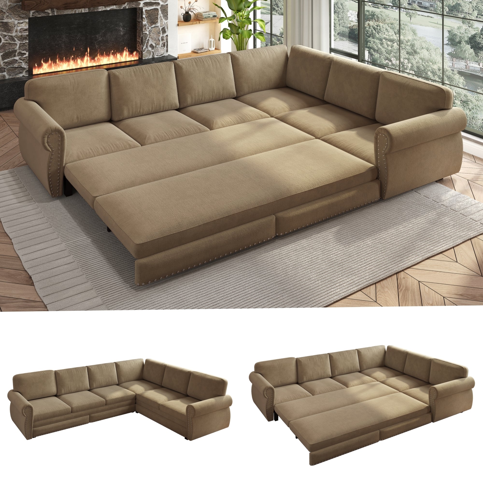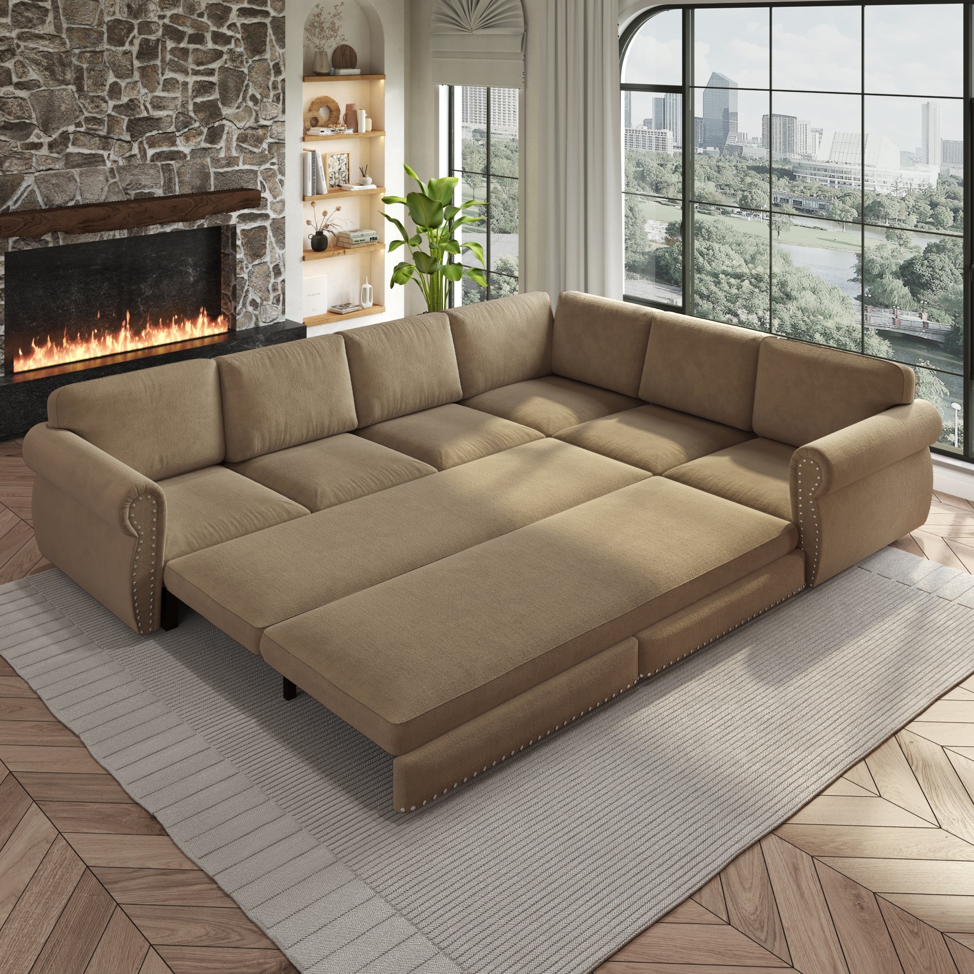 LLappuil Sectional Sofa, Pull Out Sofa Bed King Size, 6 Seat Chenille Sofa Couch Convertible Sleeper Sofa Bed for Living Room Camel