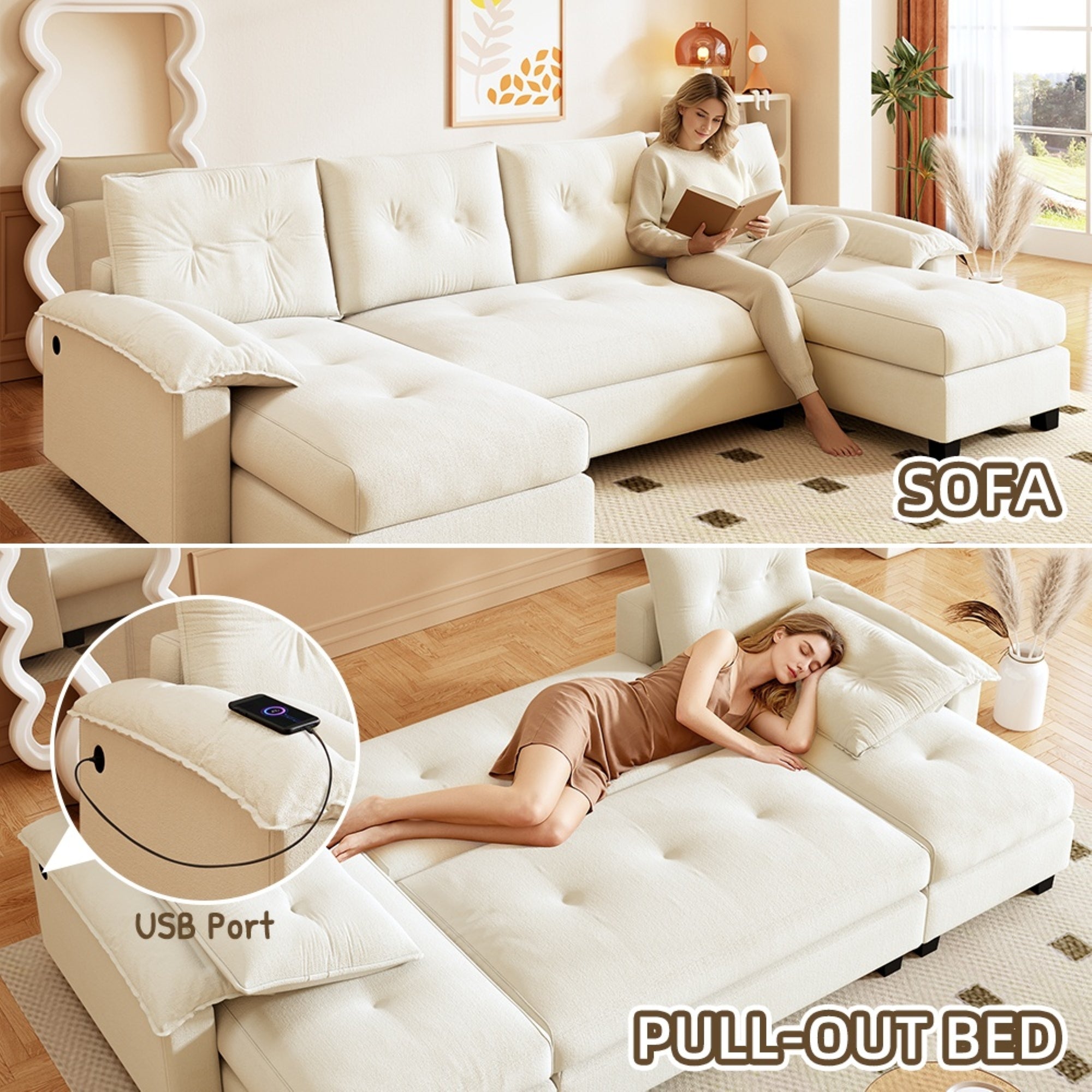 LLappuil Sectional Sofa, U Shaped Sectional Couch with Pull Out Sofa Bed, Chenille Convertible Sleeper Sofa Bed with Chaise, Removable Armrests, USB Ports Beige
