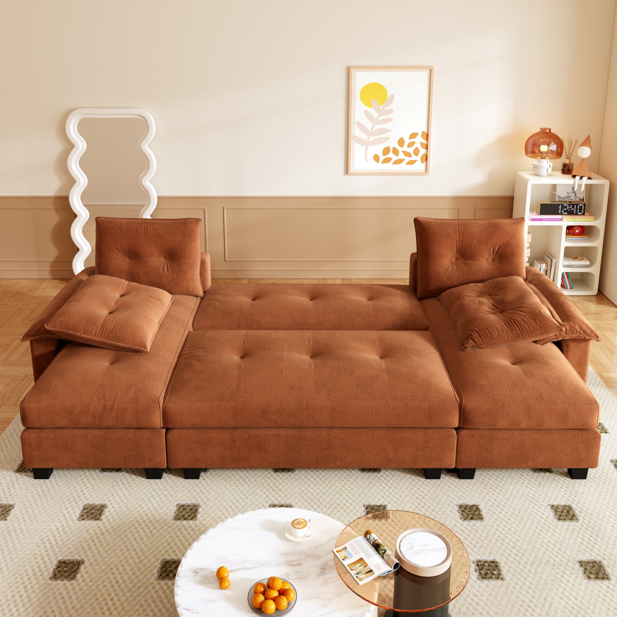 LLappuil Sectional Sofa, U Shaped Sectional Couch with Pull Out Sofa Bed, Chenille Convertible Sleeper Sofa Bed with Chaise, Removable Armrests, USB Ports Orange