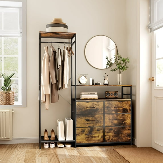 Multi-Functional LED Garment Rack with 6 Drawers - Freestanding Clothes Organizer with Shelves and Hanging Rod, Entryway Storage Dresser, Brown