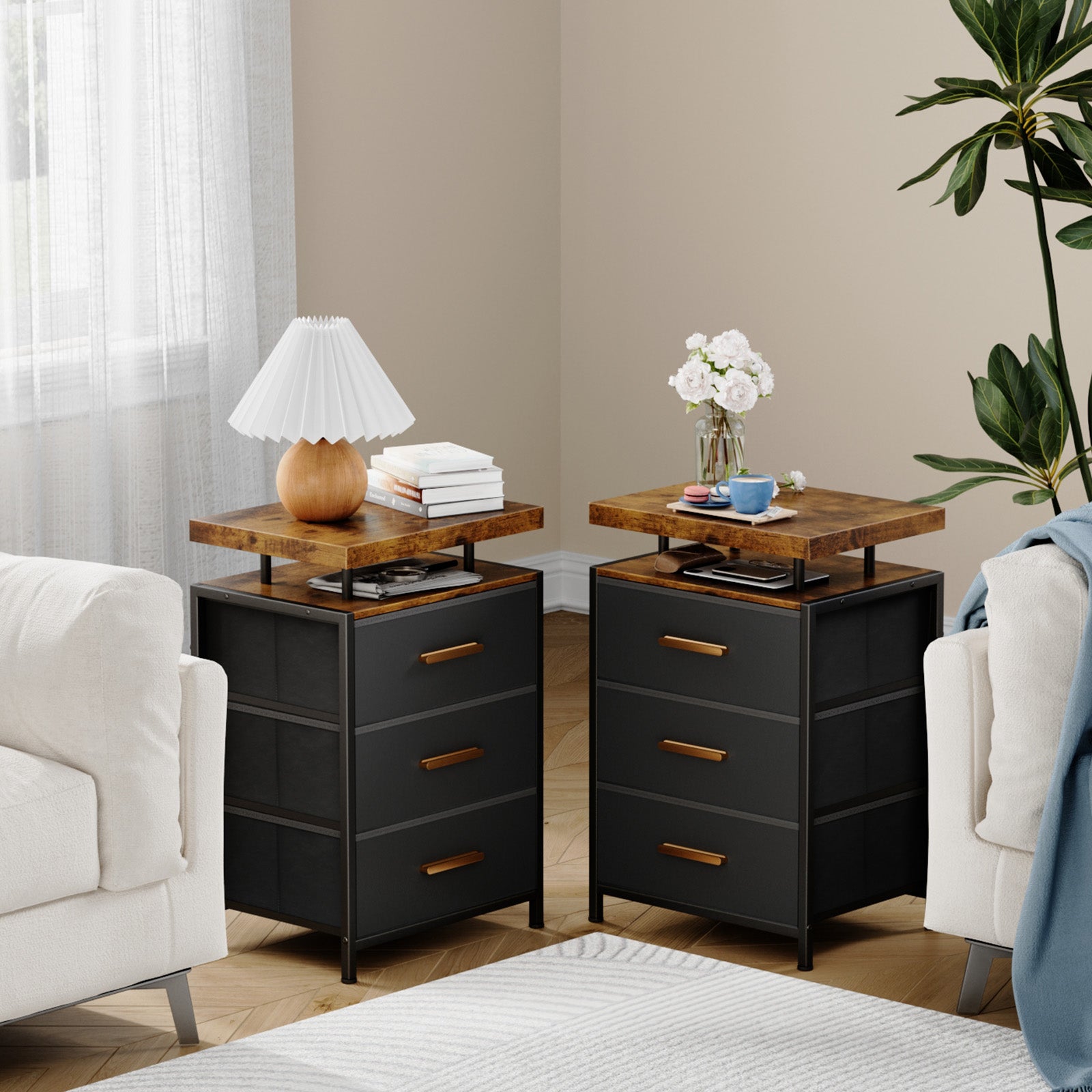 Smart LED Nightstand with 3 Drawers Modern Design Table for Bedroom, Closet, Dorm,Black (2 packs)